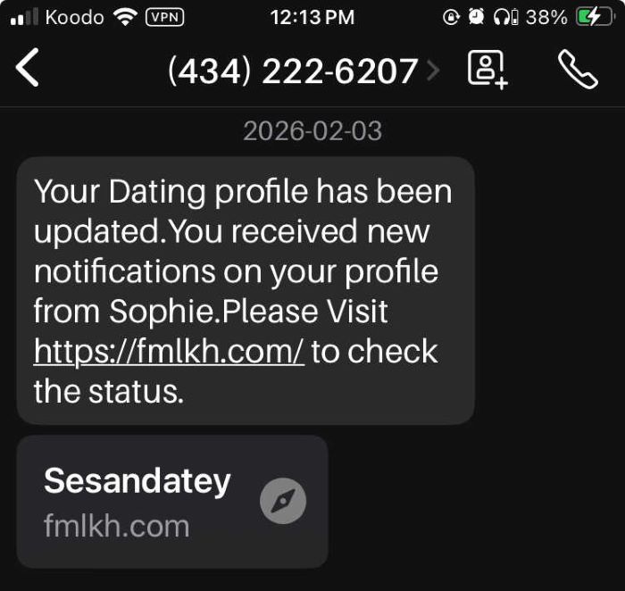 434-222-6207 - This dating site smishing scam sends unsolicited text messages claiming that your dating profile has been updated or that you received new notifications from someone (often using names like Sophie). The messages urge recipients to click a suspicious link such as fmlkh.com, sometimes branded as “Sesandatey / Sesandate.” The texts are commonly sent from rotating phone numbers, including (434) 222-6207 and 844-634-3120, and are designed to lure victims into clicking malicious links. These pages may attempt to steal personal information, enroll users in hidden subscription services, or redirect them to further phishing or scam sites. Some reports indicate the operation is linked to overseas scam activity. Do not click the link, do not reply to the message, and block the sender immediately. If you interacted with the site, change your passwords, monitor financial accounts, and run a security scan on your device.